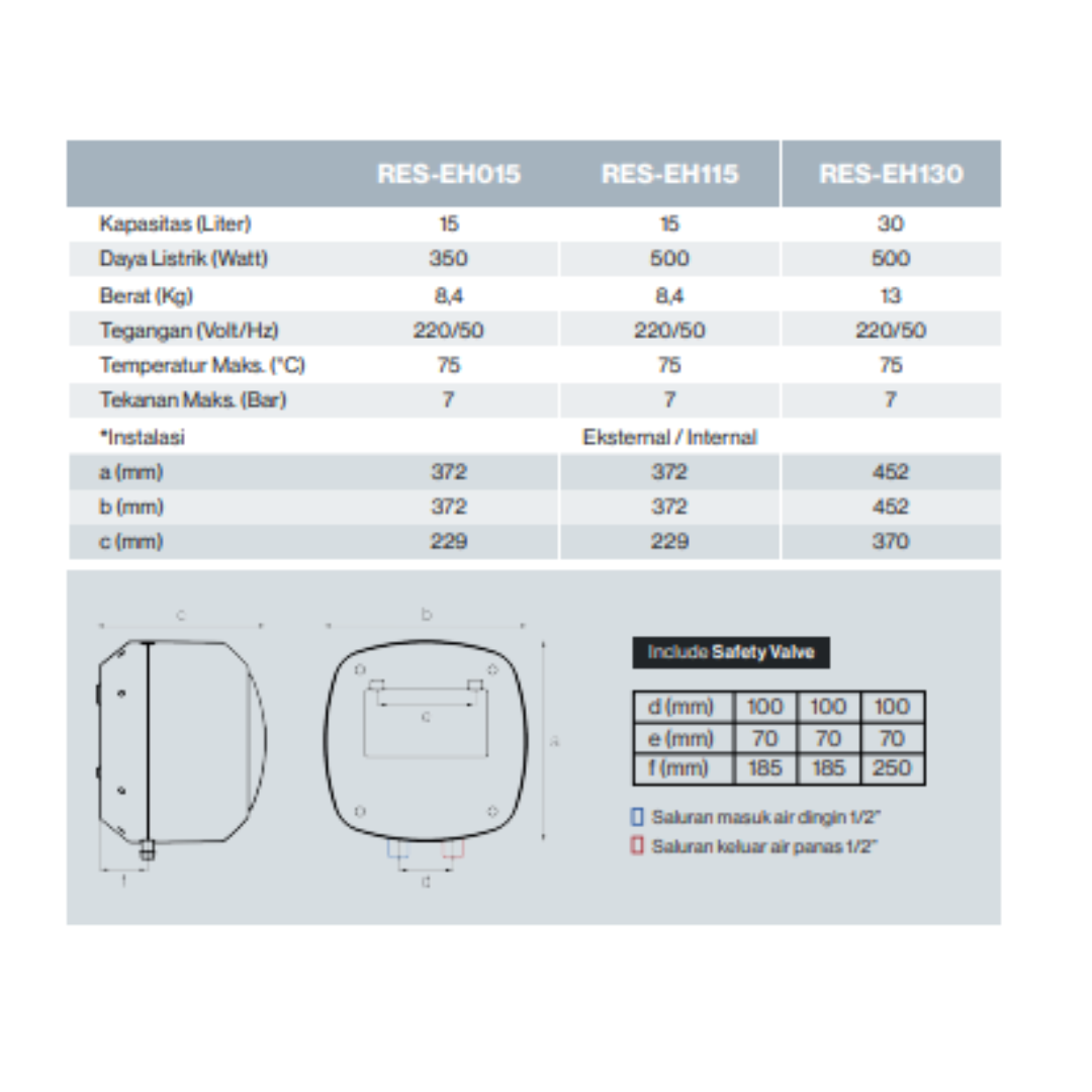 Rinnai - Ultimate Series - RES - EH menggunakan elemen pemanas berbahan Incoloy yang tahan karat dan tidak mudah keropos, dan menjadi solusi ideal untuk kebutuhan mandi air hangat Anda. Dengan kapasitas yang dirancang untuk satu orang, water heater ini memberikan kemudahan bagi keluarga anda untuk menikmati kenyamanan mandi air hangat kapan saja.