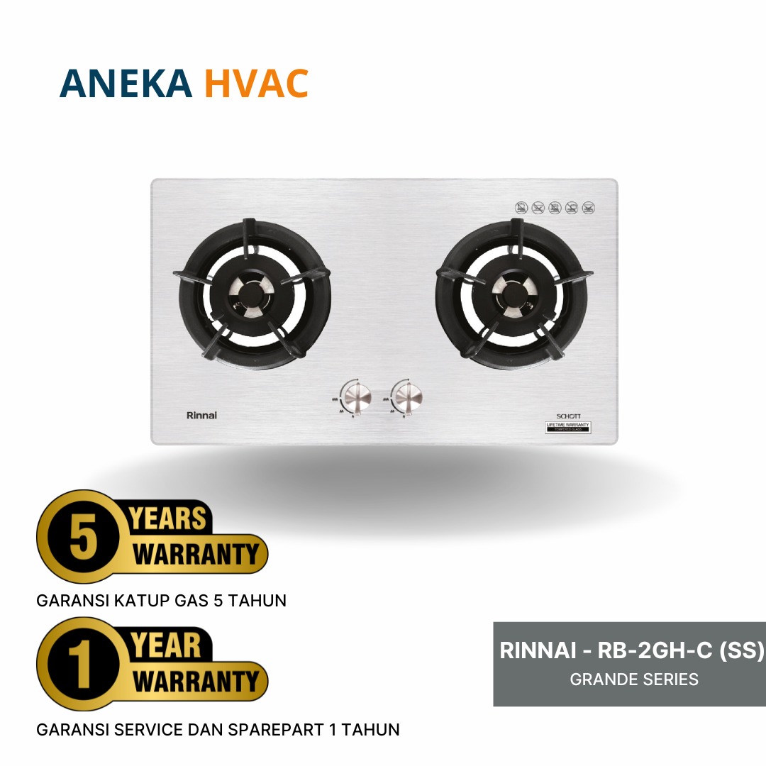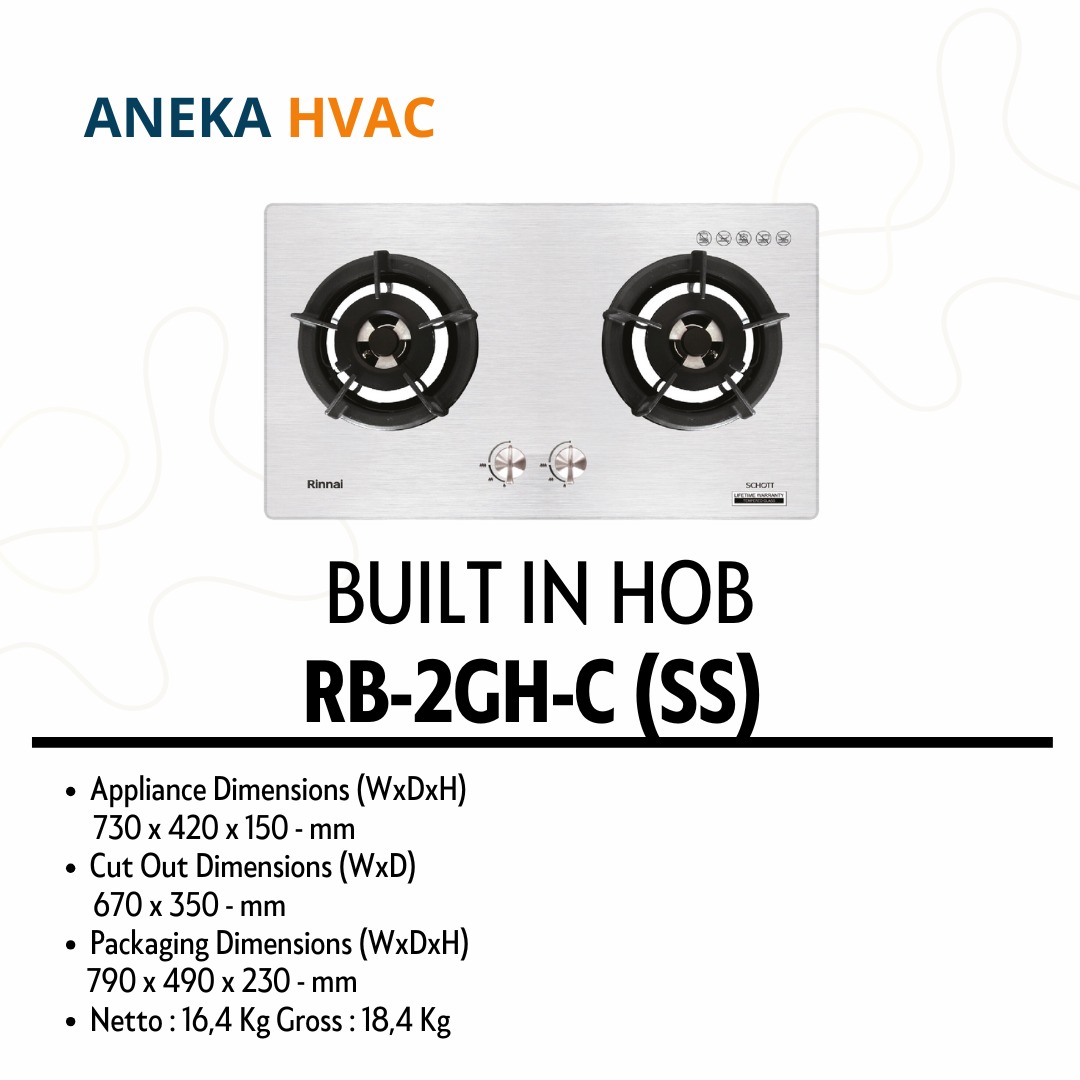 Rinnai - Gas Hob - RB-2GH-C (SS) adalah Kompor dengan dua tungku yang di lengkapi finishing stainless steel hairline memberikan tampilan dapur yang sederhana, fungsional, dan modern. Jadikan dapur anda bukan hanya sekadar ruang untuk memasak, tetapi juga menjadi elemen penting dalam desain interior yang estetis untuk rumah. Kompor ini memiliki body dari bahan stainless steel, yang membuatnya kuat, tahan terhadap karat, dan memiliki daya tahan yang panjang.