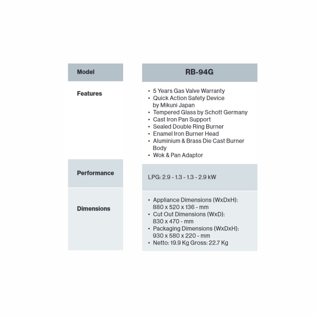 Rinnai - Gas Hob - RB-94G adalah desain yang sederhana dan cocok untuk melengkapi dapur Anda. Kompor ini mudah digunakan, dilengkapi dengan fitur child lock untuk keamanan, serta memiliki bodi yang kuat dan tahan lama.