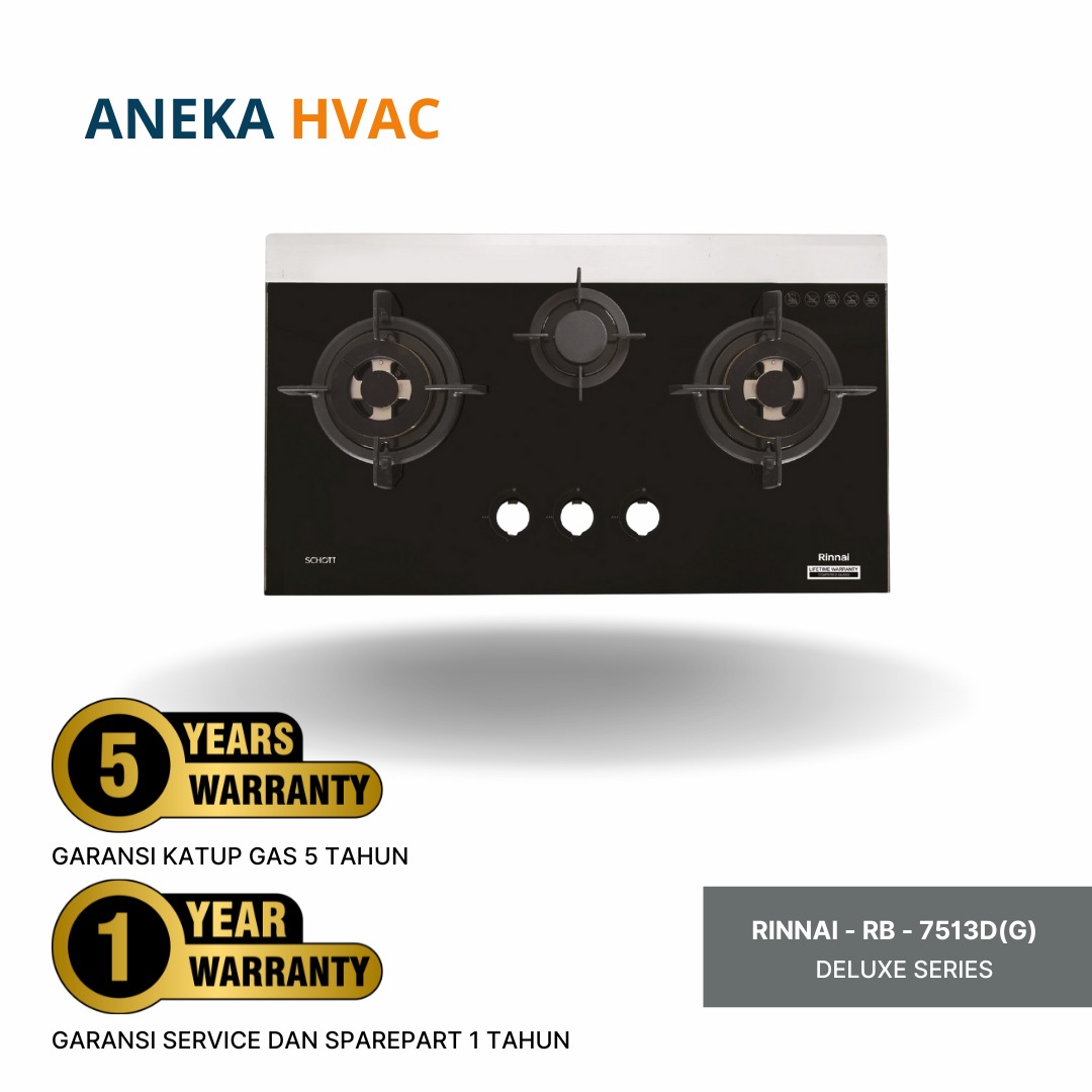 Rinnai - Gas Hob - RB-7513D(G) adalah kompor tanam tiga tungku yang dilengkapi top plate berbahan tempered glass dari Schott Germany, ini memberikan tampilan kompor anda lebih mewah dan elegan. Kompor ini juga terdapat tempered glass yang memastikan kualitasnya tetap terjaga.