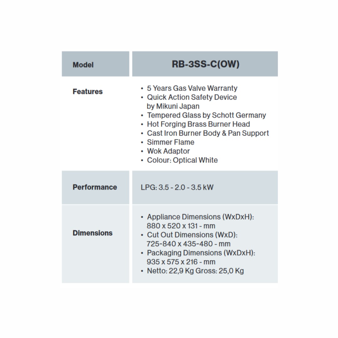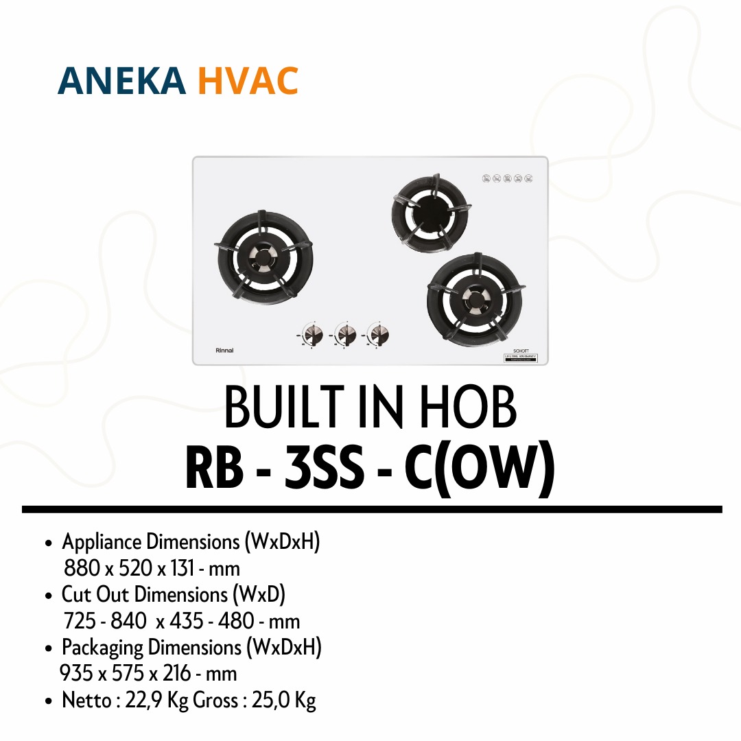 Rinnai - Gas Hob - RB - 3SS - C(OW) adalah kompor tanam tiga tungku berwarna optical white ini menghadirkan kesan dapur yang simpel, fungsional, dan modern. Jadikan dapur anda bukan sekadar tempat memasak, tetapi juga menjadi elemen desain interior yang mempercantik rumah.
