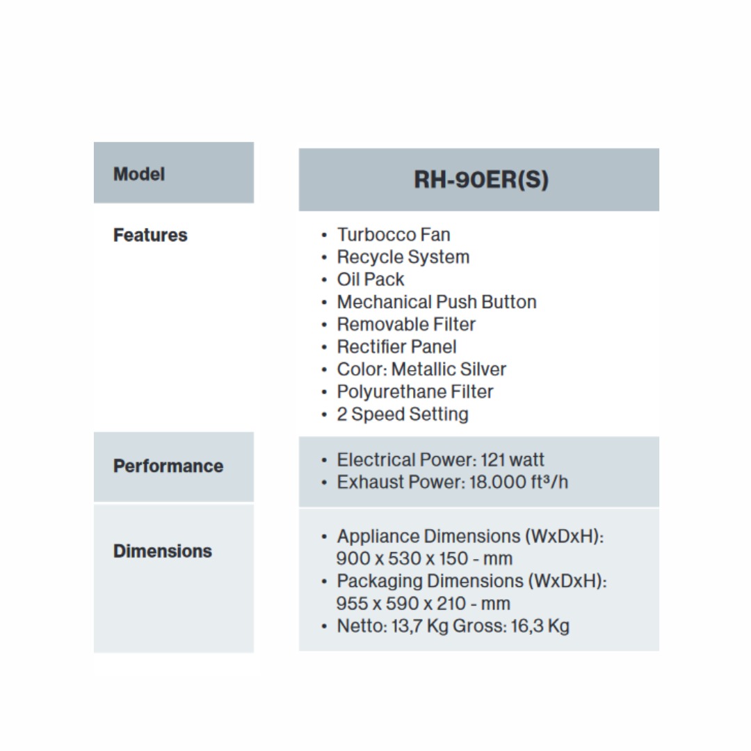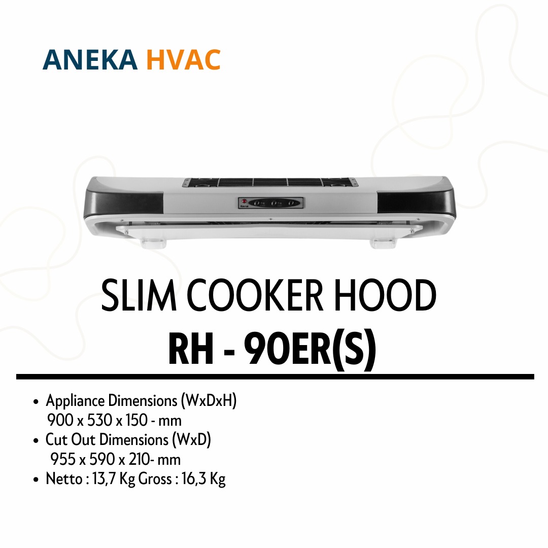 Rinnai - Slim Hood RH-90ER(S) adalah Cooker Hood berwarna stainless steel dengan ukuran 90 cm ini dirancang sebagai penghisap asap dapur yang efektif untuk mengeluarkan asap masakan. Dilengkapi oil pack untuk menampung minyak, recycle system untuk sirkulasi ulang asap, desain modern, dan suara yang minim, RH-90ER(S) cocok untuk dapur Anda.