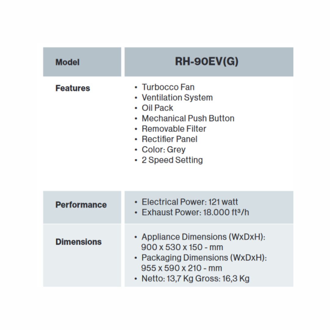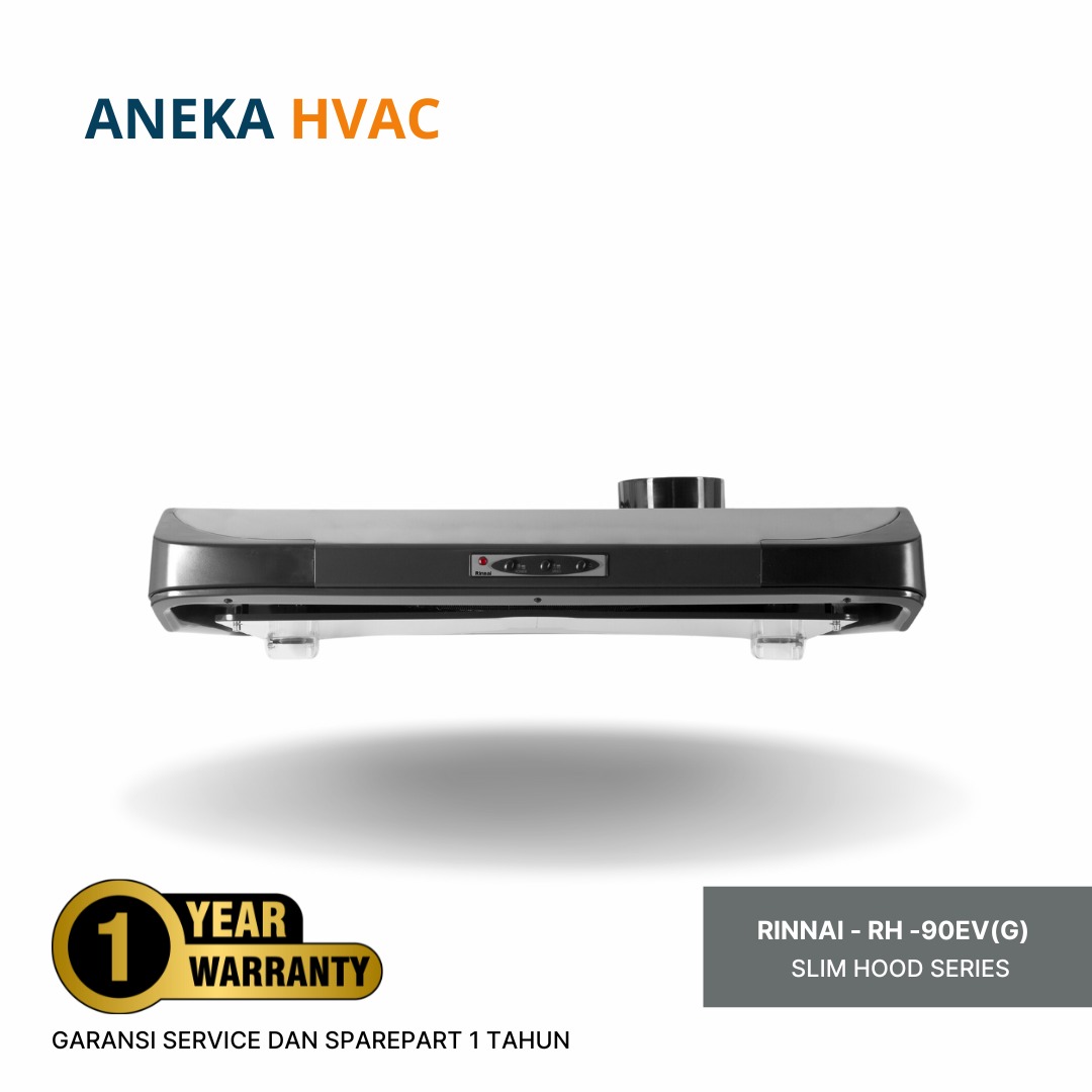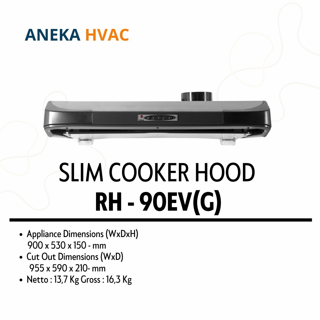 Rinnai - Slim Hood RH-90EV(G) adalah Cooker Hood berwarna stainless steel dengan ukuran 90 cm ini dirancang sebagai penghisap asap dapur yang efektif untuk mengeluarkan asap masakan. Dilengkapi oil pack untuk menampung minyak, recycle system untuk sirkulasi ulang asap, desain modern, dan suara yang minim, RH-90ER(S) cocok untuk dapur Anda.