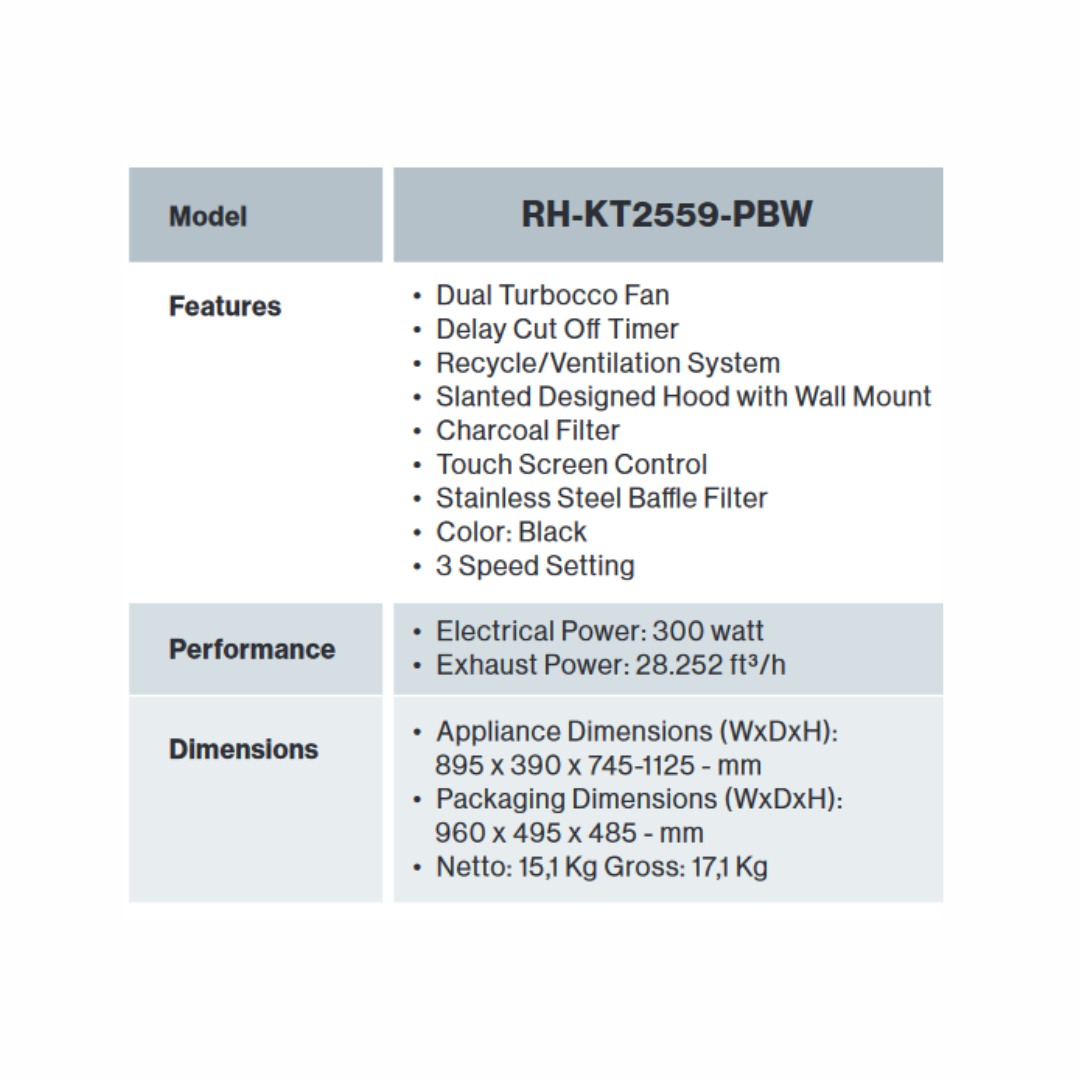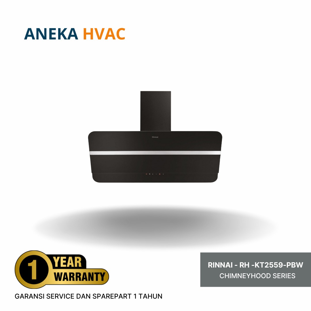 Rinnai - Chimney Hood RH-KT2559-PBW  bagian dari Chimney Hood Series dengan desain elegan berwarna hitam yang menambahkan nuansa modern pada dapur Anda. Dengan daya hisap hingga 28.252ft³/jam, cooker hood ini efektif menghilangkan asap dan bau, menjaga udara dapur tetap segar.