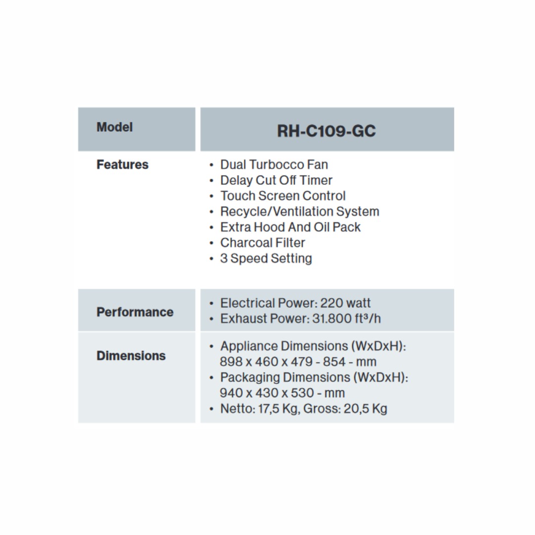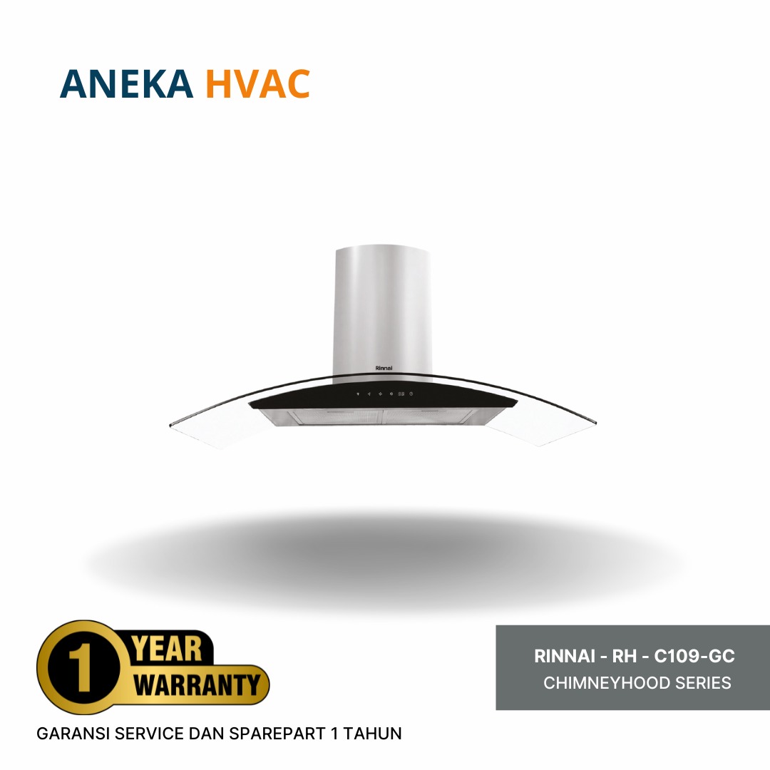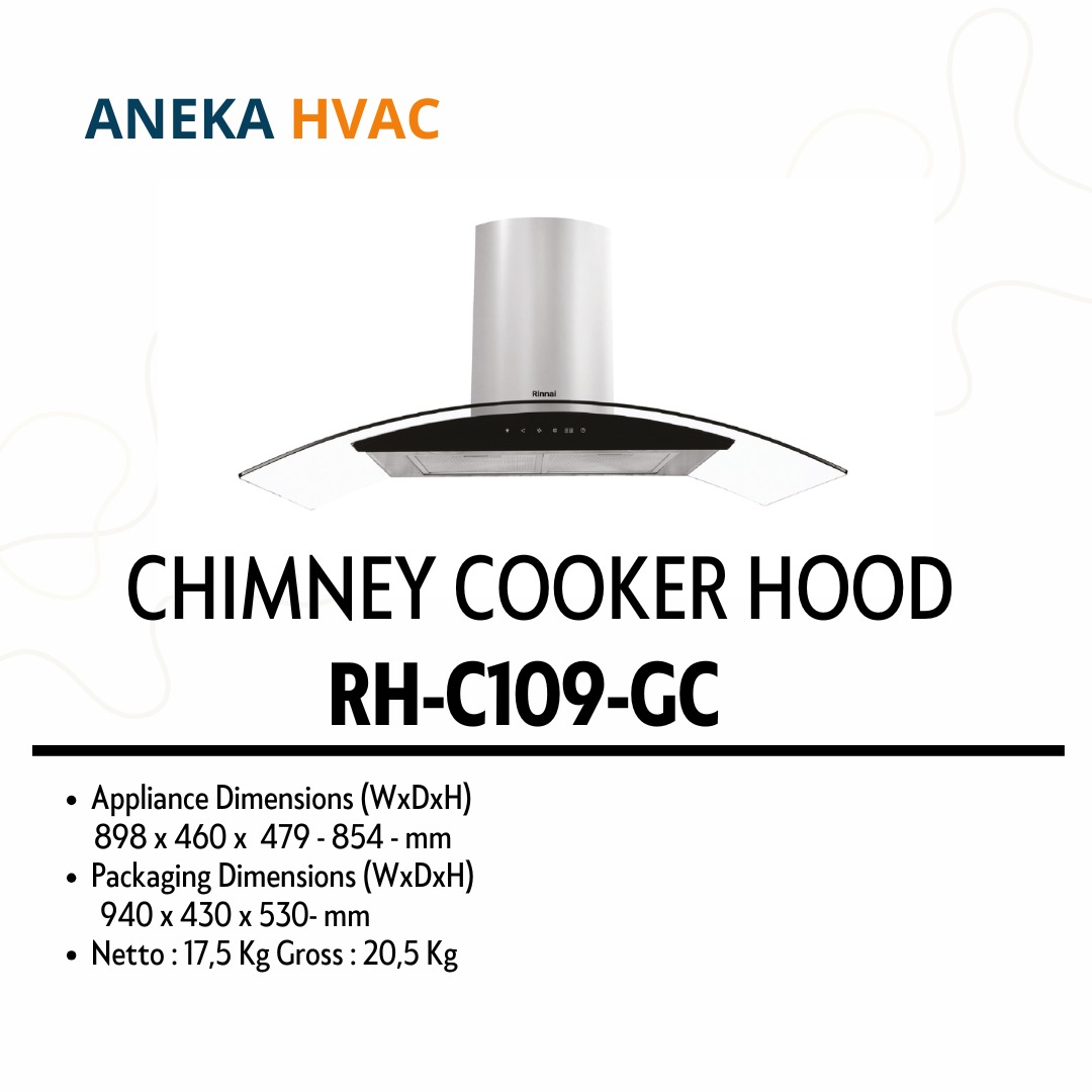 Rinnai - Chimney Hood RH-C109-GC adalah Cooker hood yang dilengkapi fitur Delay Cut-Out Timer dan layar sentuh yang memudahkan pengoperasian, menjadikannya pilihan ideal untuk dapur bergaya elegan. Dengan daya hisap tinggi, perangkat ini mampu menghilangkan sisa asap masakan dengan cepat dan efisien.