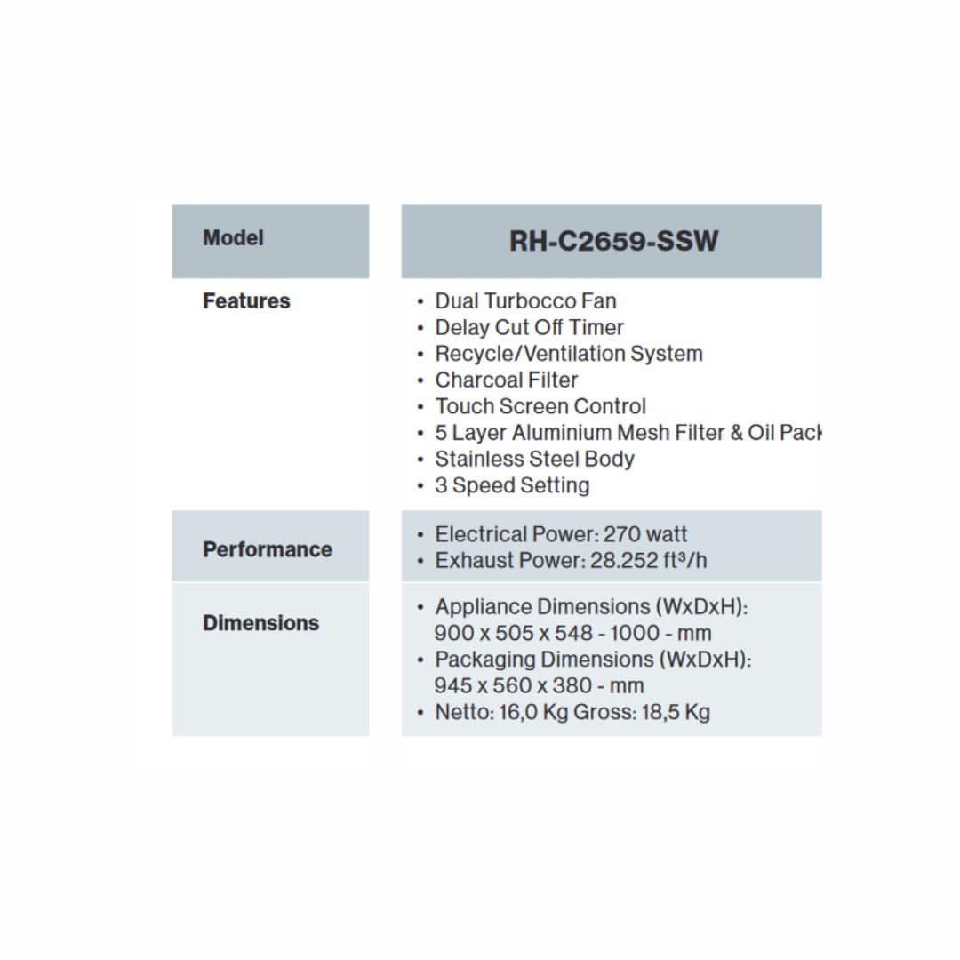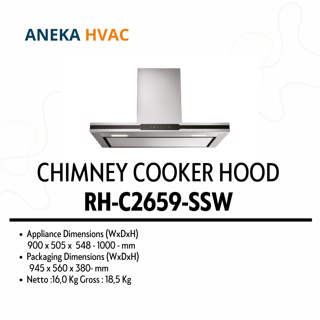 Rinnai - Chimney Hood RH-C2659-SSW Dengan desain simpel dan minimalis, cooker hood ini mampu memperindah dapur Anda. Dilengkapi teknologi modern seperti kontrol layar sentuh, lampu LED, dan 3 tingkat kecepatan hisap, alat ini mempermudah aktivitas memasak Anda.