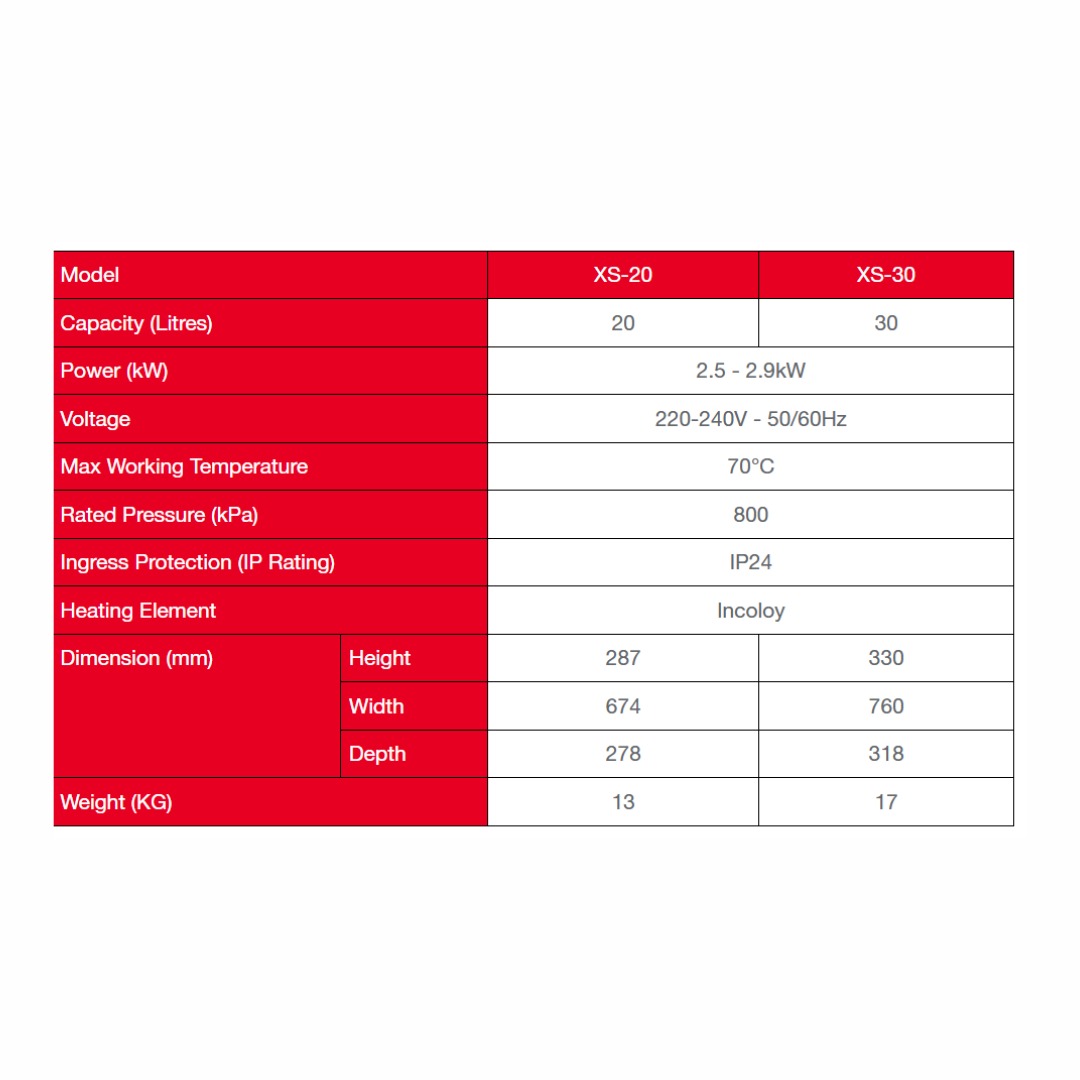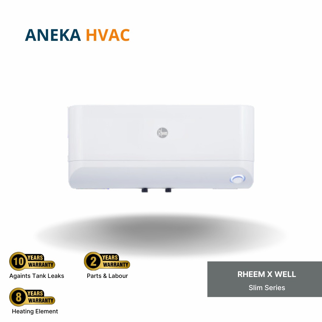 Rheem- Xwell - Slim Series tersedia dalam kapasitas penyimpanan 20 dan 30 liter, terdapat Diffuser RheemHot+ ™ Eksklusif yang memberikan lebih banyak air panas untuk mandi lebih lama dan Lapisan enamel RheemGlas ™  dalam tangki untuk meminimalkan korosi dan memperpanjang umur tangki.