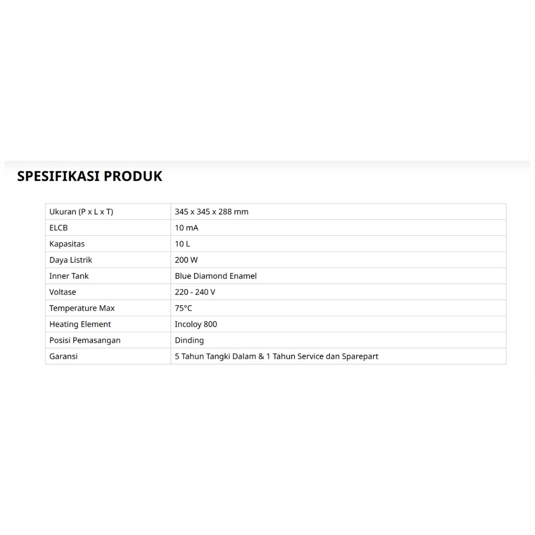 Water Heater SHIMIZU SEH-210 adalah pemanas air listrik otomatis yang dirancang untuk memberikan kenyamanan dan kemudahan dalam menikmati air hangat di rumah kapan pun. Dengan kapasitas hingga 10 liter, perangkat ini cocok untuk penggunaan individu. Selain itu, konsumsi daya listriknya hanya sebesar 200 watt, sehingga efisien untuk kebutuhan sehari-hari.