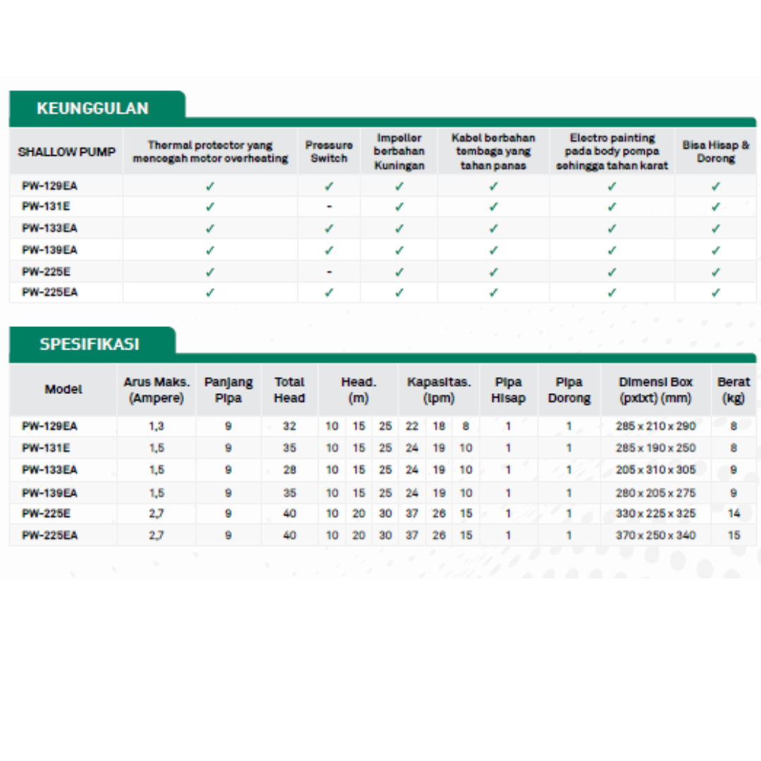 Pompa sumur dangkal WASSER PW-225E hadir dengan performa tinggi, desain kokoh, dan daya hisap kuat untuk memenuhi kebutuhan air rumah tangga maupun usaha kecil. Dibekali teknologi modern serta material premium, pompa ini mampu bekerja dengan efisien dan tahan lama meski digunakan secara intensif setiap hari.