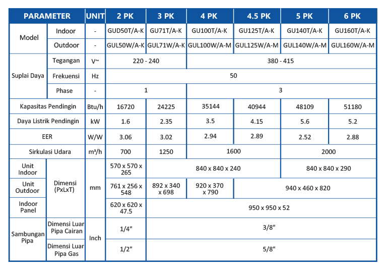 Seri ini tersedia dalam dua varian, yaitu Standard dan Inverter, sehingga pengguna dapat memilih sesuai kebutuhan efisiensi dan performa pendinginan.