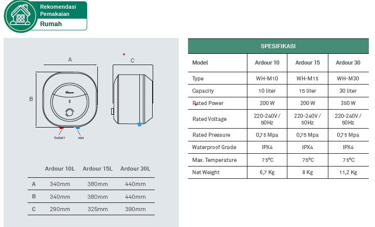 Tampil dengan desain minimalis dan modern, water heater ini cocok dipadukan dengan berbagai gaya interior kamar mandi, menjadikannya bukan hanya aman, tetapi juga menambah estetika ruang.