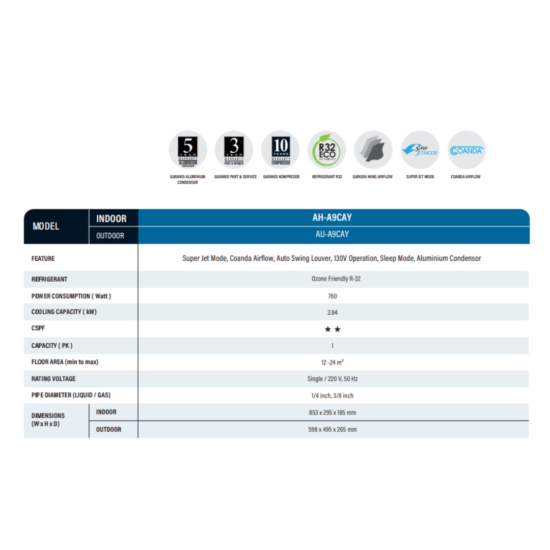 AC Sharp CAY Series dirancang untuk memberikan kesejukan optimal dengan performa yang stabil dan efisien. Unit ini mampu mendinginkan ruangan secara merata sehingga nyaman digunakan untuk hunian, kantor, maupun area usaha. Kualitas material yang kuat serta suara operasional yang halus menjadikan AC Sharp CAY Series ideal untuk penggunaan sehari-hari.