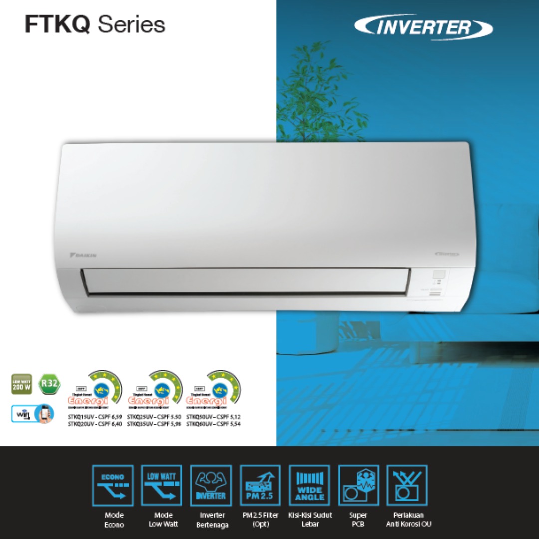AC Daikin Inverter FTKQ Series dirancang untuk memberikan pendinginan yang efisien dengan performa yang stabil dan nyaman. Teknologi inverter memungkinkan AC bekerja lebih hemat listrik dengan penyesuaian daya sesuai kebutuhan, sehingga suhu ruangan tetap sejuk sepanjang hari.