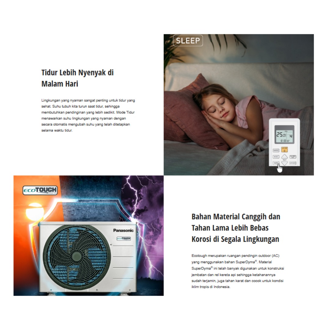 Dilengkapi Mode POWERFUL untuk membantu ruangan lebih cepat dingin saat pertama kali dinyalakan. Penggunaan refrigerant R32 yang ramah lingkungan membantu meningkatkan efisiensi pendinginan sekaligus lebih aman bagi lingkungan. Selain itu, unit outdoor berteknologi Ecotough dirancang tahan karat dan cuaca ekstrem, sehingga lebih awet dan cocok digunakan di iklim tropis Indonesia.