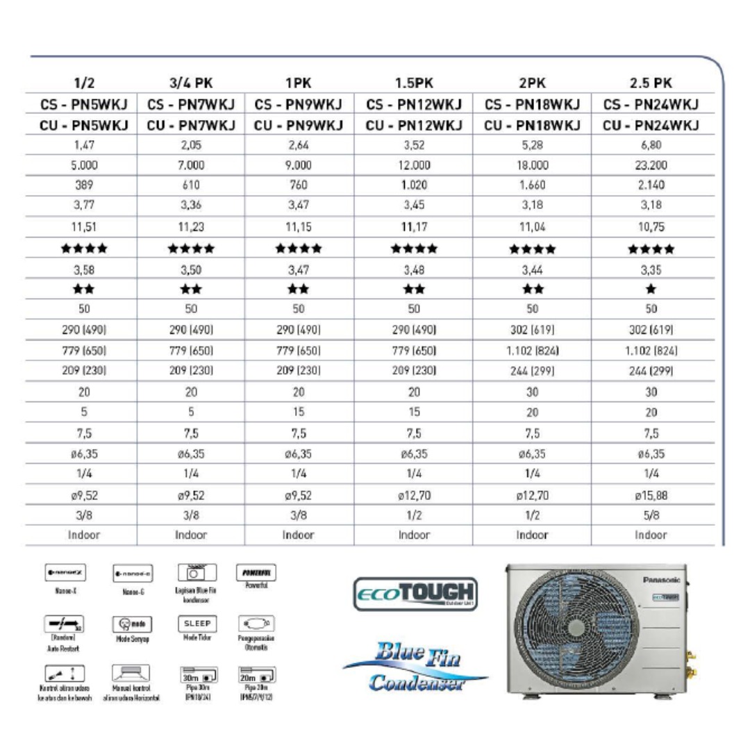 AC Panasonic Deluxe Standard PN Series (WKJ) dirancang untuk memberikan pendinginan nyaman, stabil, dan andal untuk kebutuhan hunian maupun ruang kerja. Dengan performa yang optimal dan fitur esensial khas Panasonic, seri ini menjadi pilihan tepat bagi Anda yang menginginkan AC standar dengan kualitas premium.