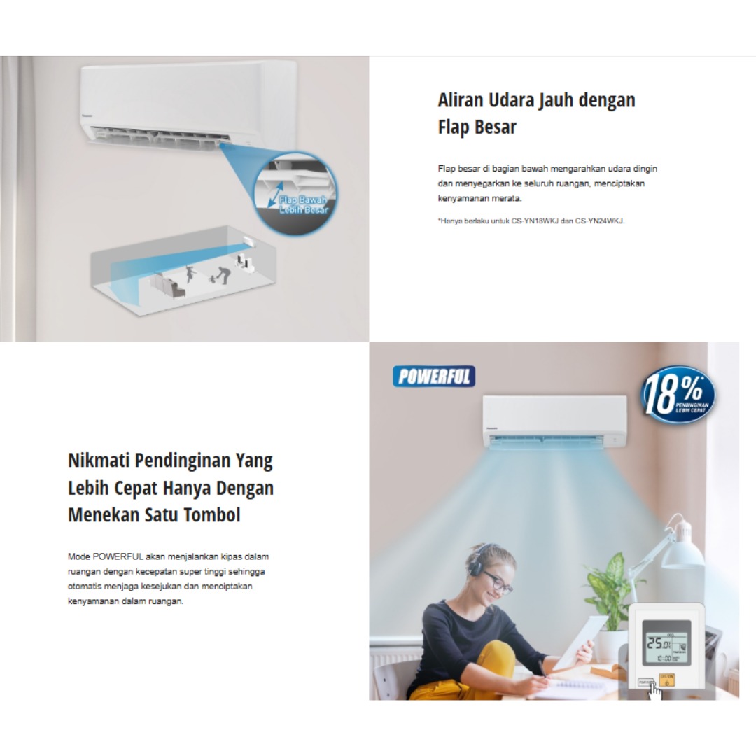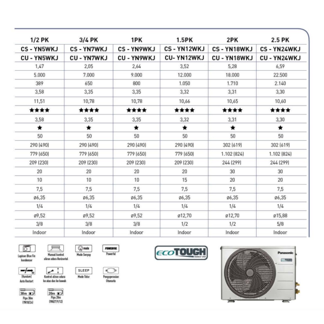 AC Panasonic YN Series (WKJ) merupakan pilihan tepat untuk kebutuhan pendinginan harian yang praktis, stabil, dan ekonomis. Seri standar ini dirancang untuk memberikan kesejukan yang konsisten dengan konsumsi listrik yang efisien, cocok digunakan di rumah tinggal maupun ruang kerja.