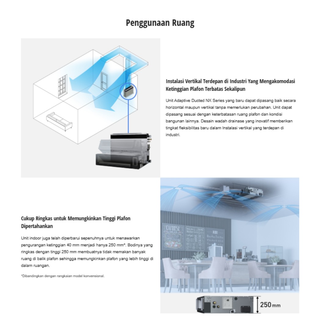 Seri NX menawarkan fleksibilitas instalasi dengan tekanan statis yang dapat disesuaikan, sehingga mudah diadaptasi pada berbagai desain ducting dan kebutuhan tata ruang. Operasi yang lebih senyap, performa yang andal, serta efisiensi energi menjadikan unit ini pilihan tepat untuk penggunaan jangka panjang.