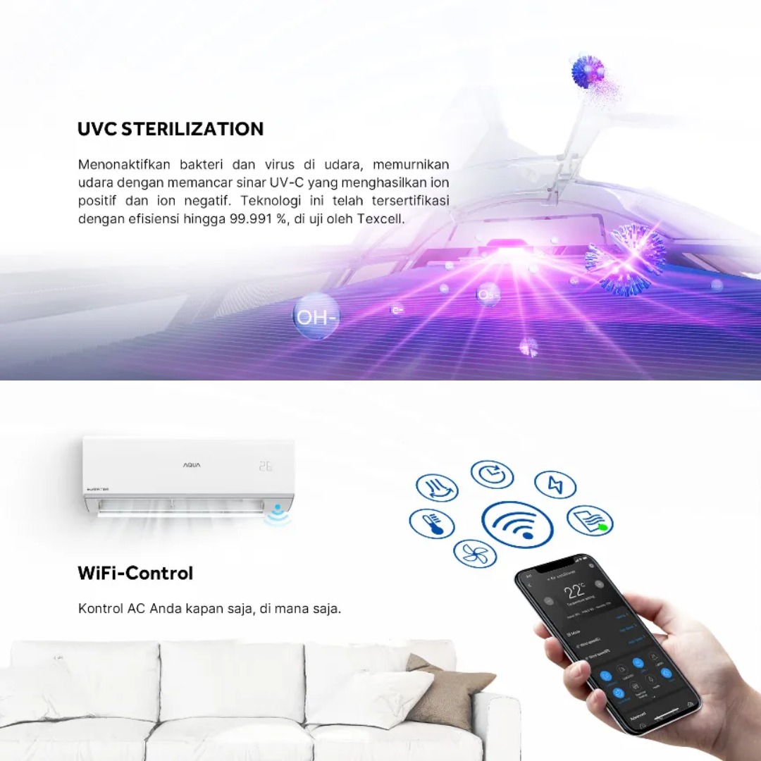 AQUA UV Cool Smart Air Conditioner AQA-KCRVRAL dirancang untuk memberikan kenyamanan maksimal sekaligus kualitas udara yang lebih sehat. Dilengkapi teknologi UV Cool, AC ini membantu menghambat pertumbuhan bakteri dan mikroorganisme pada udara yang bersirkulasi, sehingga ruangan terasa lebih bersih dan aman untuk seluruh keluarga.
