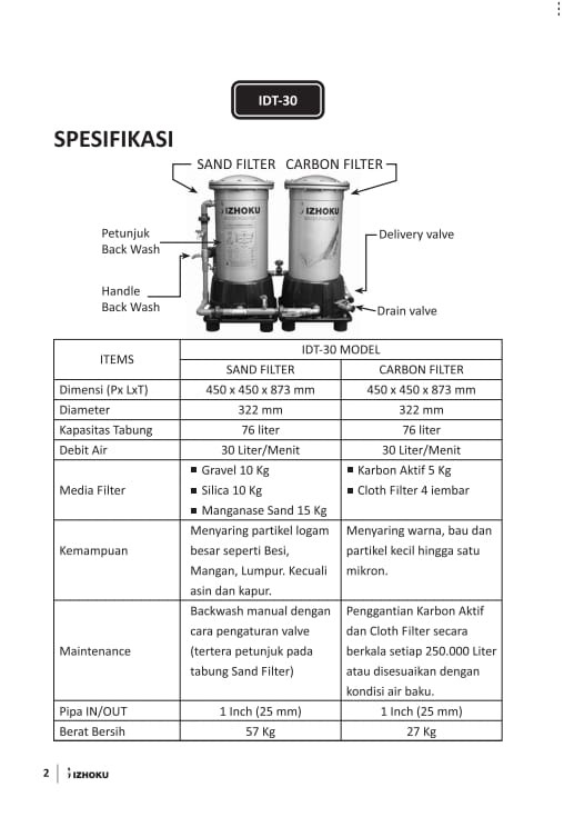 Izhoku water filter ialah perangkat penjernih air yang dirancang untuk mengatasi berbagai masalah kualitas air, seperti kandungan zat besi, mangan, kekeruhan, lumpur, warna, bau, dan partikel berbahaya lainnya. Sistemnya menggunakan teknologi penyaringan ganda, termasuk media granular, karbon aktif, dan cloth filter, yang mampu menyaring partikel hingga ukuran 1 mikron. Dengan kapasitas penyaringan yang baik, perangkat ini cocok untuk kebutuhan rumah tangga, memastikan air bersih dan sehat. Untuk hasil optimal, disarankan melakukan perawatan berkala