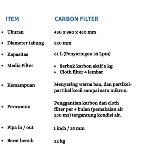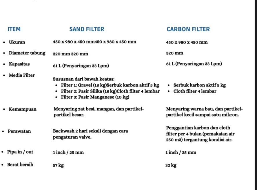 Sistem penyaringannya terdiri dari dua tahap. Tabung filter pertama menggunakan media granular untuk menghilangkan zat besi, mangan, kekeruhan, serta partikel besar. Tabung filter kedua dilengkapi dengan serbuk karbon aktif dan cloth filter untuk menyaring warna serta partikel halus hingga ukuran 1 mikron. Dengan perawatan rutin yang teratur, sistem ini dapat menjaga kualitas air tetap stabil sepanjang waktu.