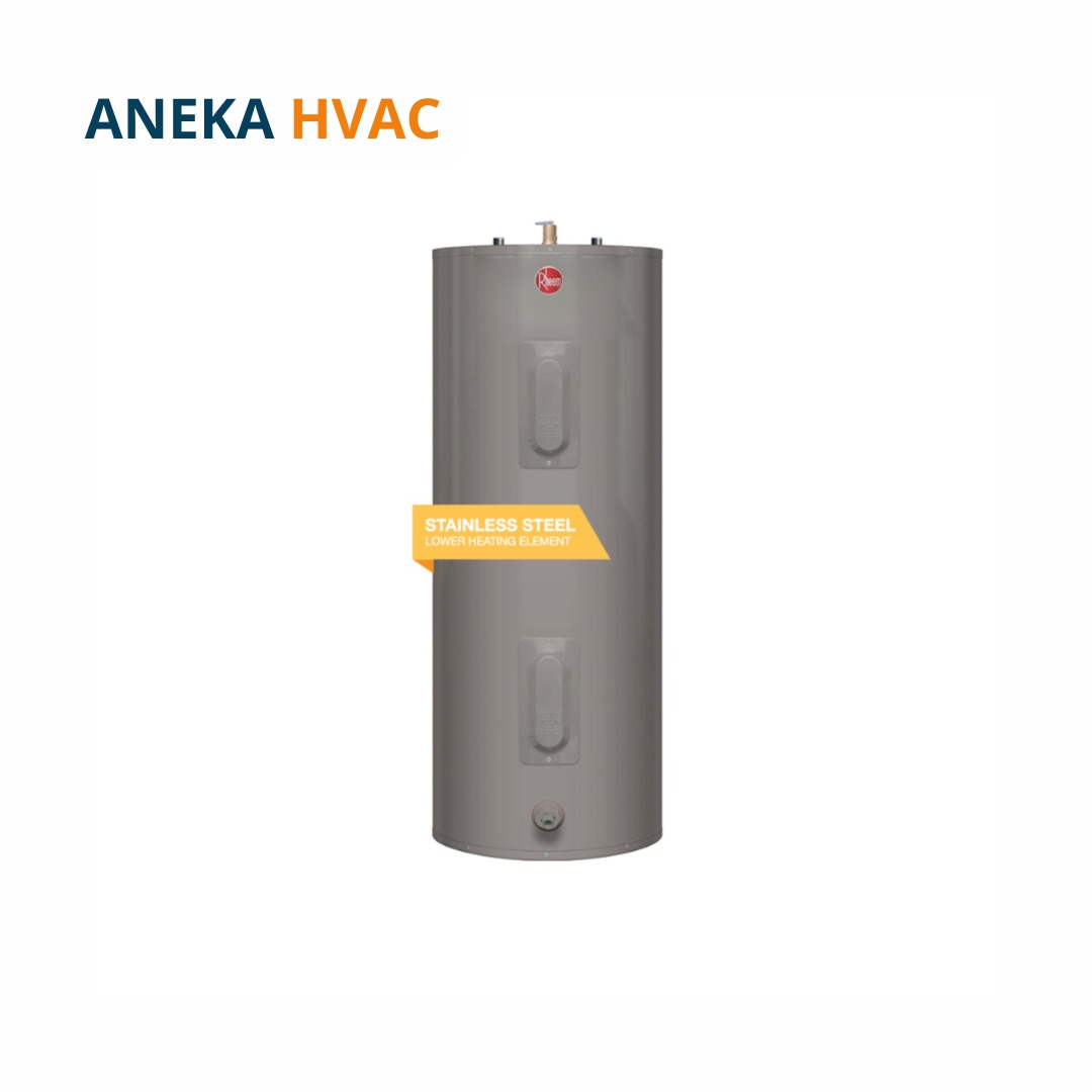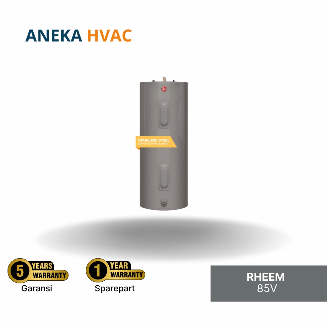 Rheem Electric Water Heater - 85 V series ini dirancang dengan elemen pemanas bawah berbahan baja tahan karat dan batang anoda bermutu premium, terdapat elemen pemanas stainless steel, insulasi padat meminamilisir heat loss, dan performa tinggi dengan biaya operasional yang rendah.