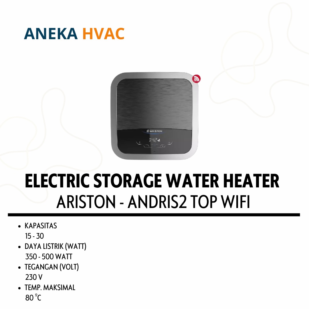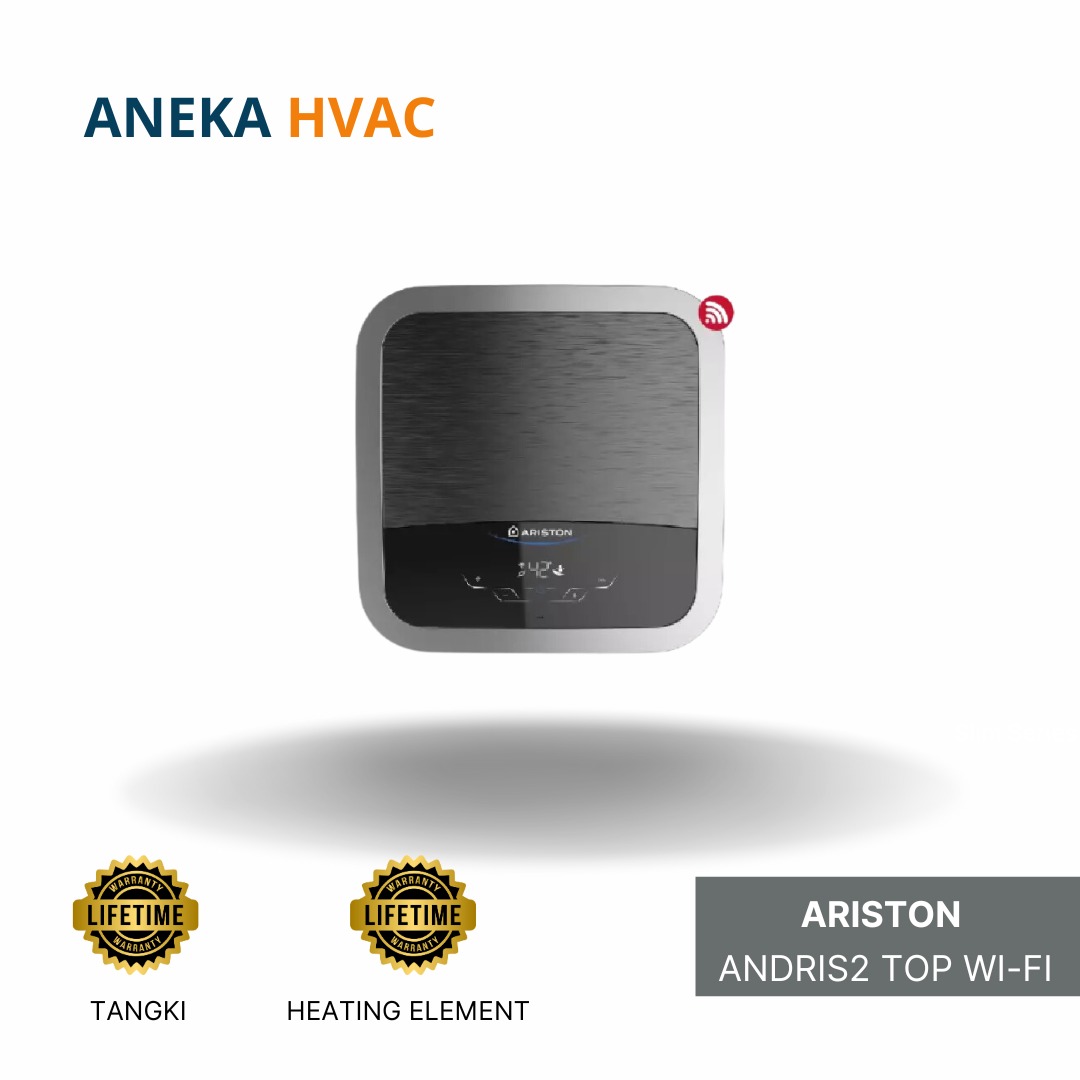 Ariston - ANDRIS2 TOP WI-FI adalah water heater yang dilengkapi wi-fi. Hal ini akan memberikan kesan elegan untuk keluarga anda. Terdapat juga garansi seumur hidup : dilengkapi elemen pemanas berbahan Titanium yang memberikan perlindungan tertinggi terhadap korosi dan timbunan karat. Dengan jaminan performa yang konsisten setiap harinya seperti pertama kali digunakan.